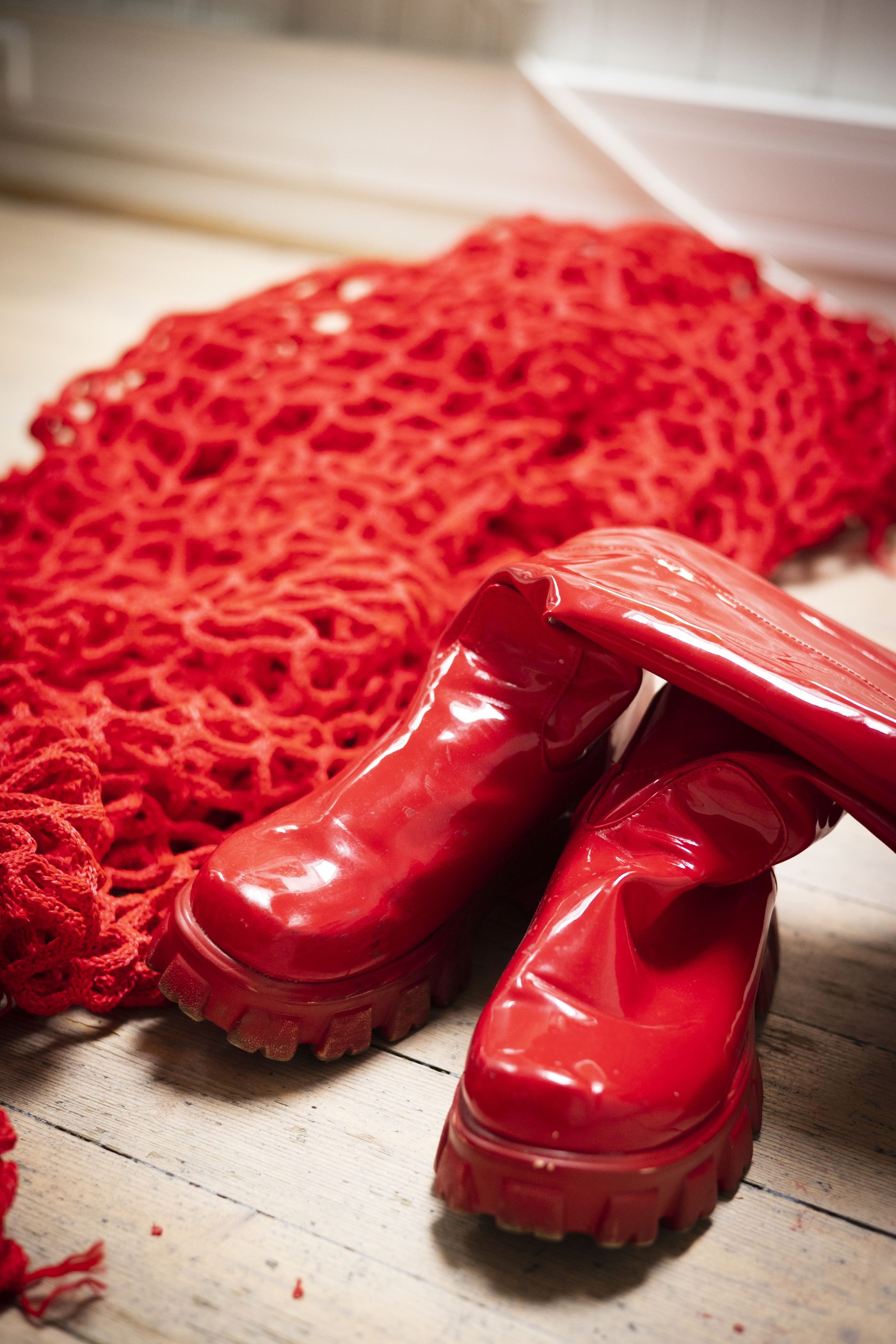 «Straffet» begynte ikke som et kostyme. Det startet som et ukonvensjonelt materiale: et sportsgarn, ment for å fange baller på en idrettsbane. Garnet var en gave fra en beundrer til den kjente svenske gatekunstneren Carolina Falkholt, en kjær venn og kollega i den dristige kunstens verden. Carolina vendte seg til Maria, og overlot henne fantasiens tøyler. Garnets enorme omfang tvang arbeidet ut i en garasje, det eneste rommet stort nok til å romme prosjektet.